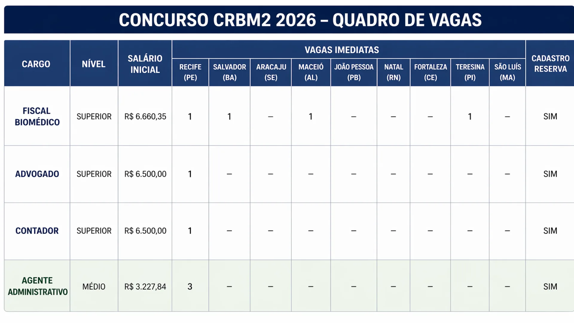 O Conselho Regional de Biomedicina da 2ª Região (CRBM2) está com inscrições abertas para o concurso público 2026, que oferece vagas imediatas e formação de cadastro de reserva em diversos estados do Nordeste. O certame contempla cargos de nível médio e superior, com salários que chegam a R$ 6.660,35 e jornada de 40 horas semanais.