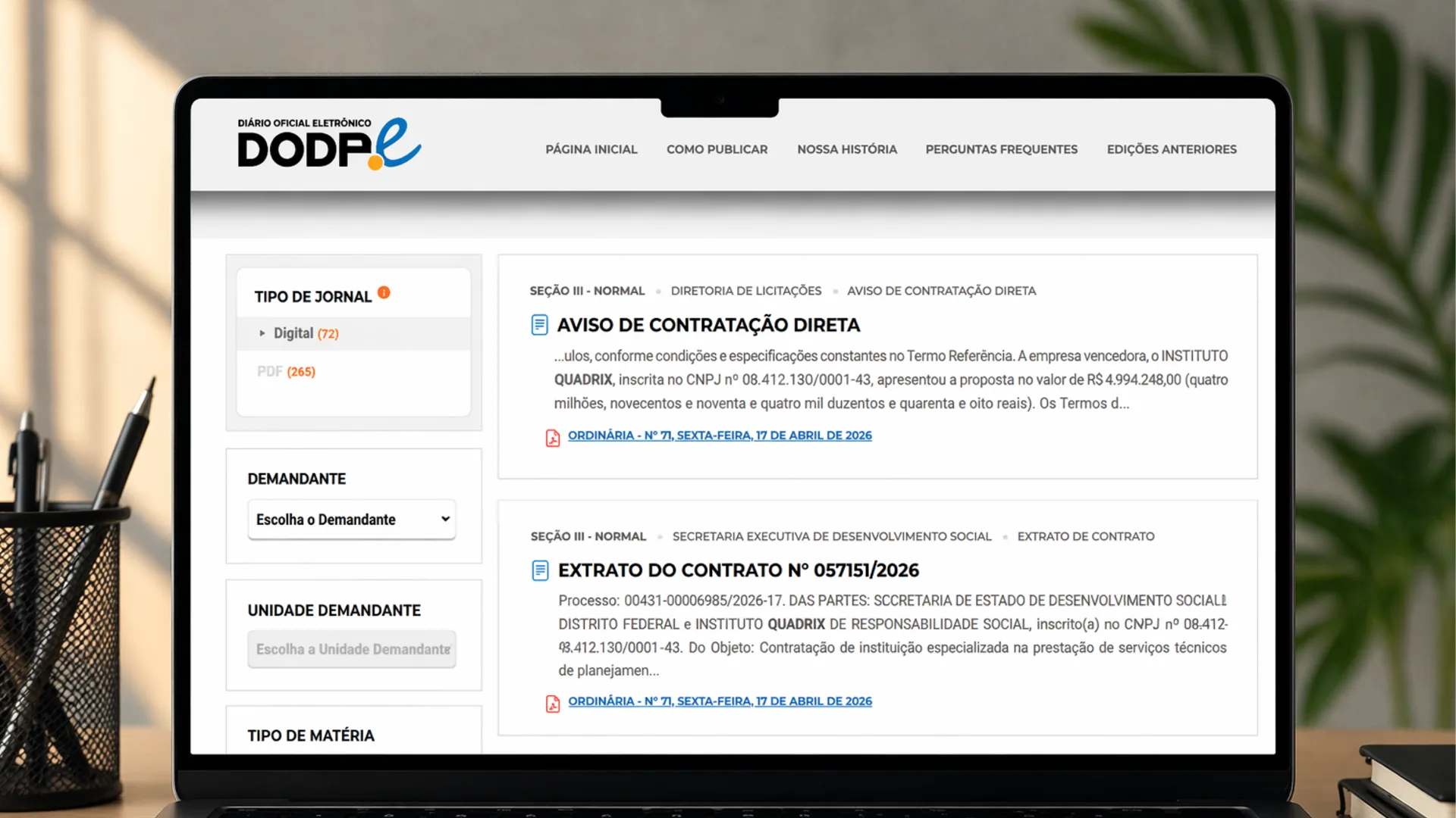 O concurso da Secretaria de Desenvolvimento Social do Distrito Federal deu um passo definitivo rumo à publicação do edital. Foi oficialmente publicado no Diário Oficial do Distrito Federal, nesta sexta-feira (17), o extrato do contrato que confirma o Instituto Quadrix como banca organizadora do certame.