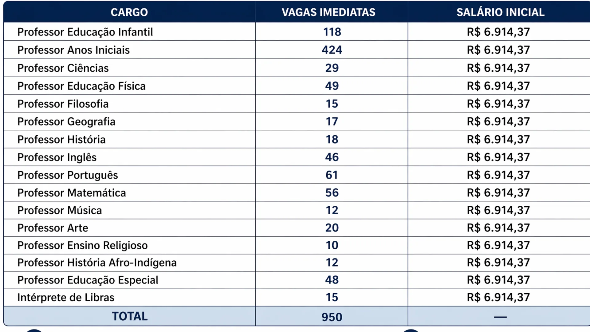 O certame oferece 950 vagas imediatas, além de 500 oportunidades em cadastro reserva, totalizando 1.450 vagas para cargos de professor em diversas áreas. A remuneração inicial é de R$ 6.914,37, para jornada de 20 horas semanais.