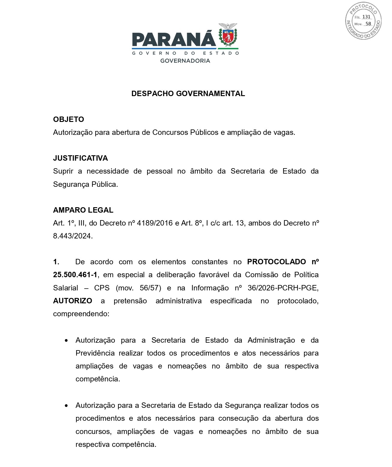 Outro ponto importante trazido pelo documento é a ampliação de vagas no concurso vigente das duas forças. O certame atual da PMPR, por exemplo, segue em andamento e já conta com milhares de candidatos aprovados nas etapas iniciais.